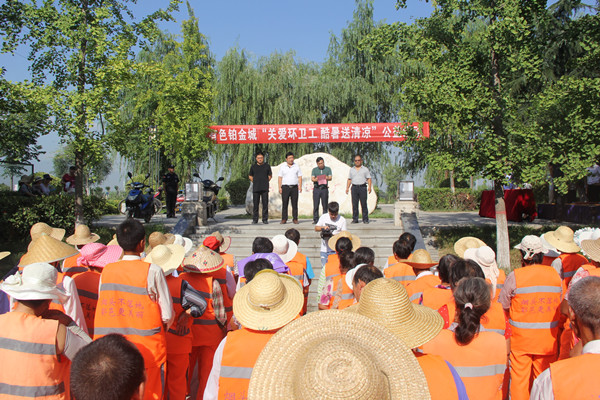 近期,我市氣溫不斷攀升,地表溫度接近六十度,整個(gè)城市就像一個(gè)大蒸籠一樣,悶熱無(wú)比。然而,環(huán)衛(wèi)工人卻冒著高溫酷暑用勤勞的雙手和汗水為城市的環(huán)境衛(wèi)生辛勤勞動(dòng)著。為了表達(dá)對(duì)環(huán)衛(wèi)工人的關(guān)心和感謝,陜西有色置業(yè)有限公司組織開(kāi)展“關(guān)愛(ài)環(huán)衛(wèi)工,酷暑送清涼”公益活動(dòng),給80余名環(huán)衛(wèi)工人送去藿香正氣水、菊花茶、驅(qū)蚊液等降暑物品。